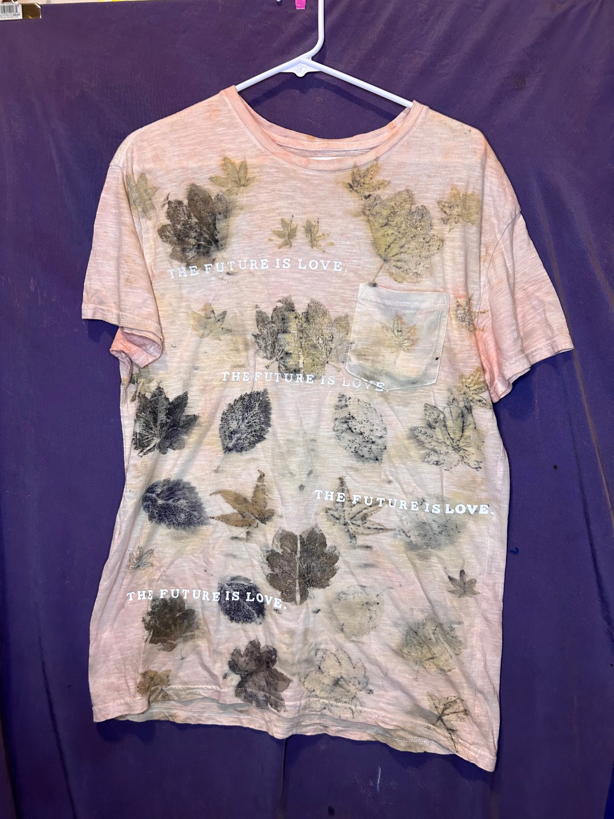 Dyed pink with foraged lobster mushrooms & eco printed the garments with maple and alder leaves.