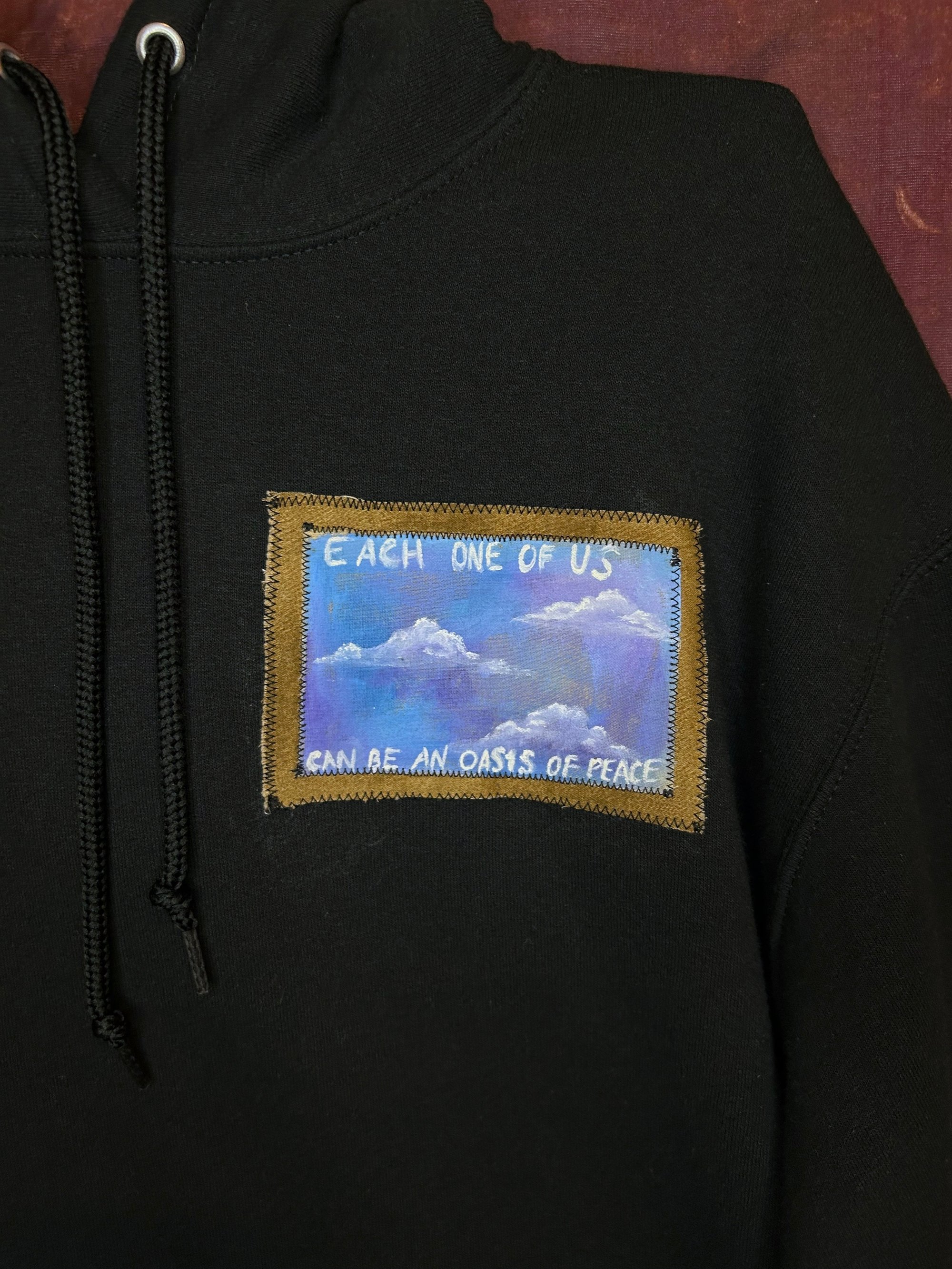 Front "Each one of us can be an oasis of piece" painted cloud portal on fabric