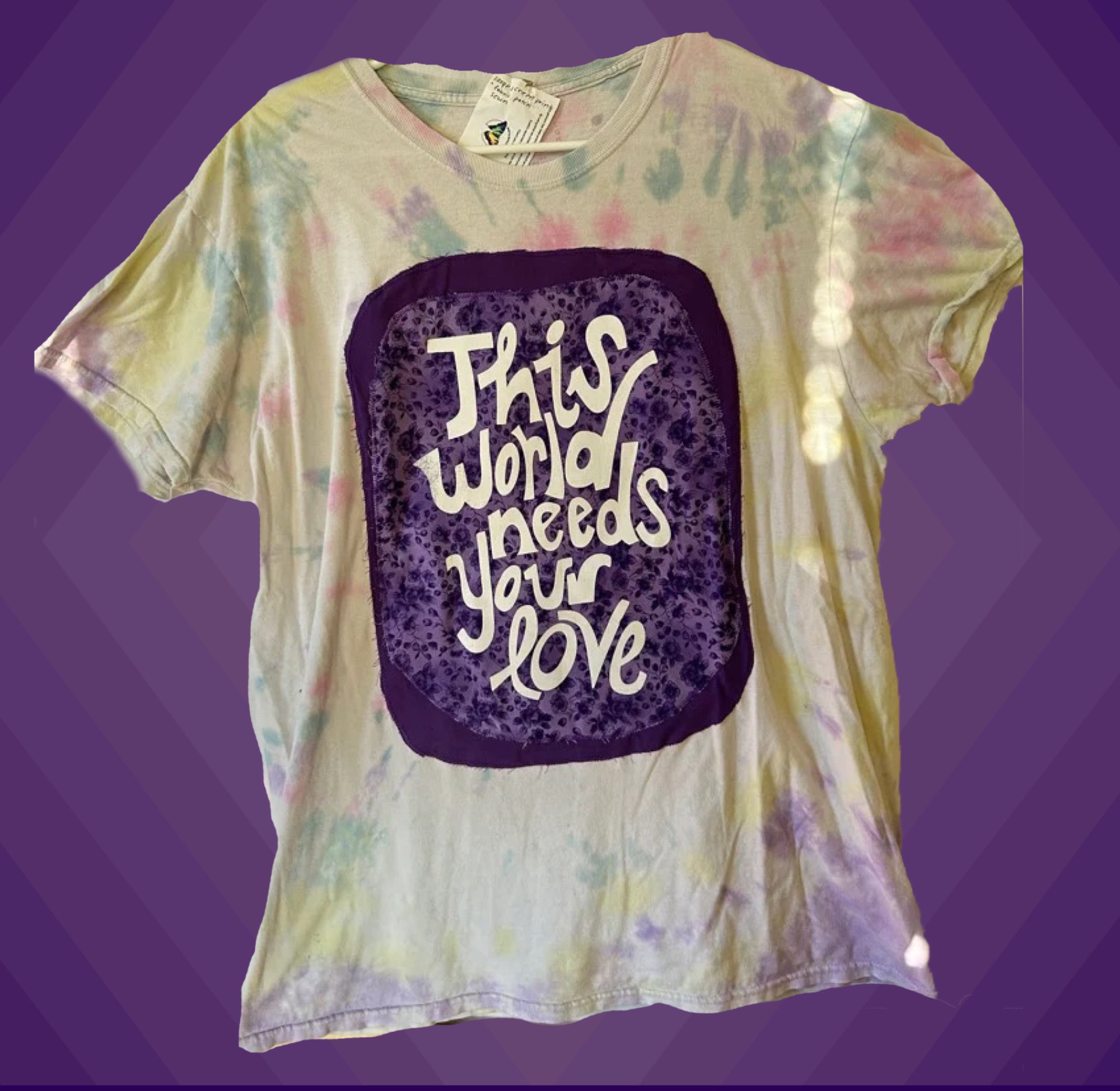ONE OF A KIND! Secondhand. Double layered purple patched screen printed & sewn on tie-dyed fruit of the look t-shirt.